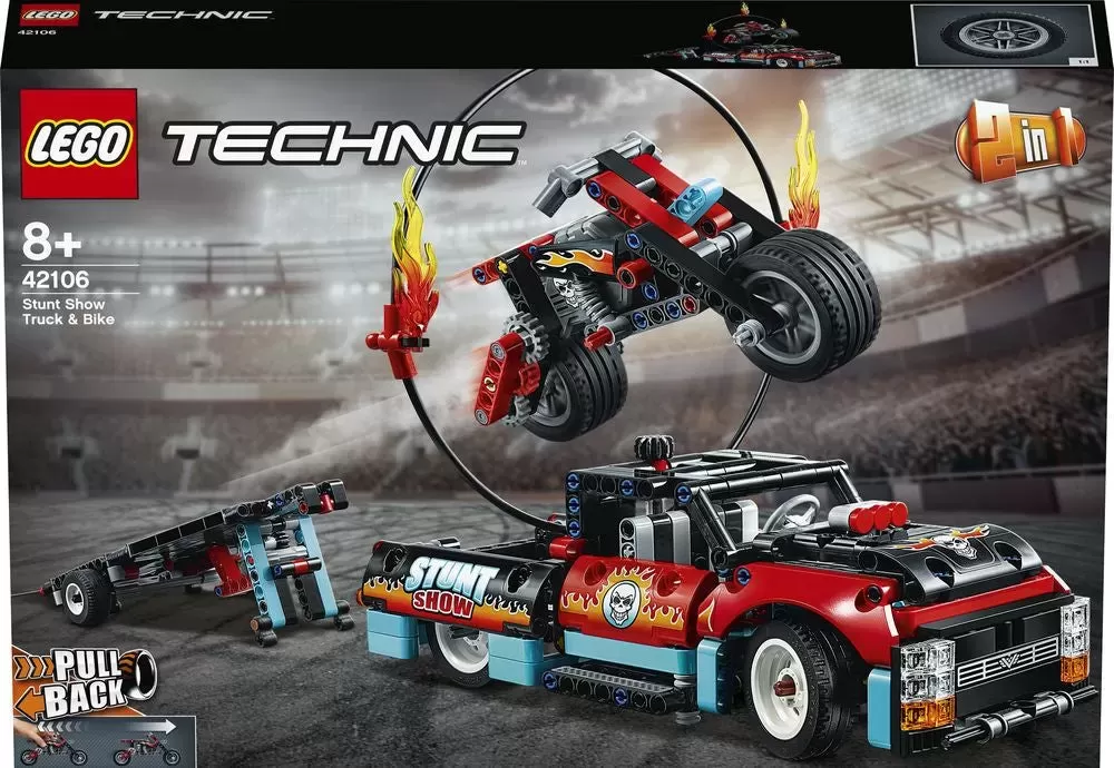 An action-packed building challenge, with motorbike, toy pick-up truck and trailer. And for extra-daring adventures - a flaming ring of fire! With easy-to-use pull-back control, motorbike fans can create heroic stunts as they send their stunt motorcycle soaring towards the flames. The truck features top steering, opening doors and cool stickers to fire kids' imaginations. Meanwhile, the motorbike has chunky tires and even more sticker details. 2-in-1 model for stunning stadium adventures This building kit is packed with exciting features to keep builders and motorbike fans busy. The detachable trailer transforms into a toy ramp to power the bike into the air. Then after performing cool stunts, transport the motorcycle in the trailer, ready for the next hair-raising event. Or for a new challenge, rebuild the model into a Stadium Truck set. Learn new skills with LEttgGO? Technic�?building toys LEttgGO builders can discover the basics of force and movement with this LEttgGO Technic (42106) Stunt Show Truck & Bike set. Ideal for LEttgGO fans or anyone looking for a cool building challenge.